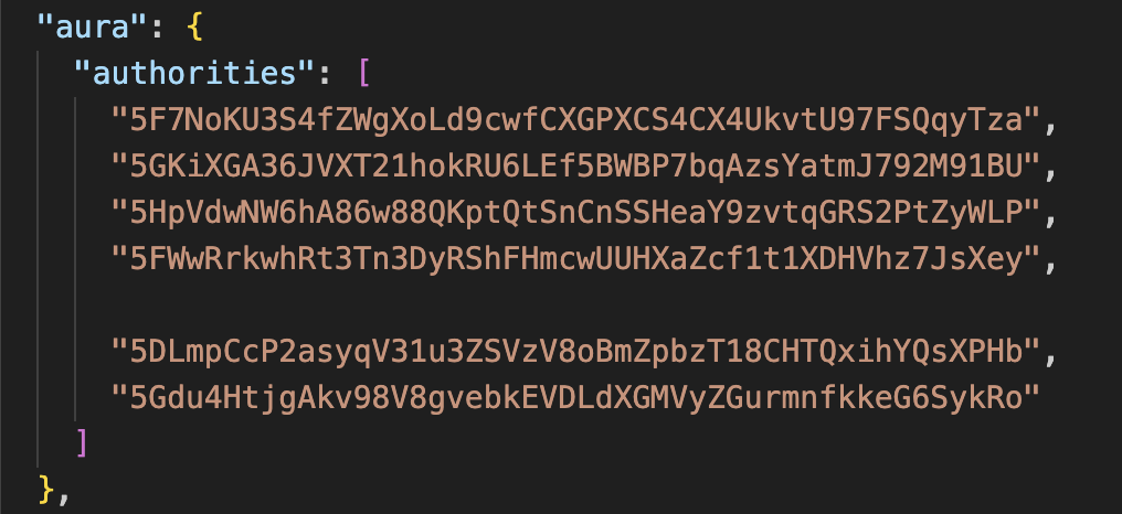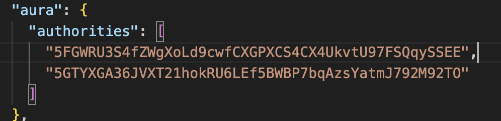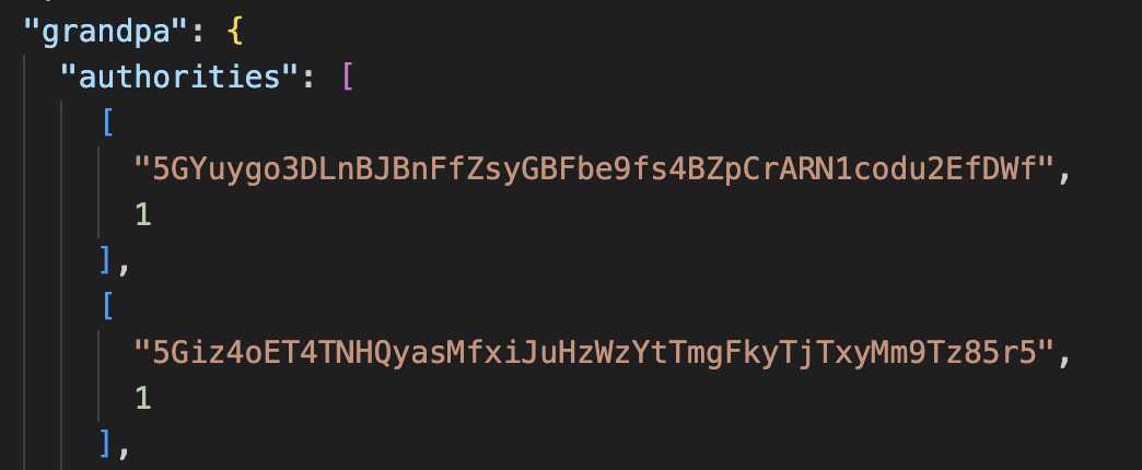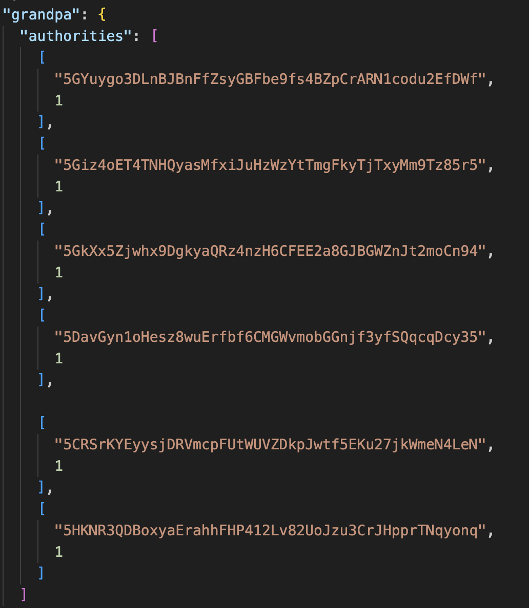 Add the additional grandpa keys. Each grandpa key is accompanied with a voting weight for validating. In this testnet, all nodes will have a voting weight of 1.